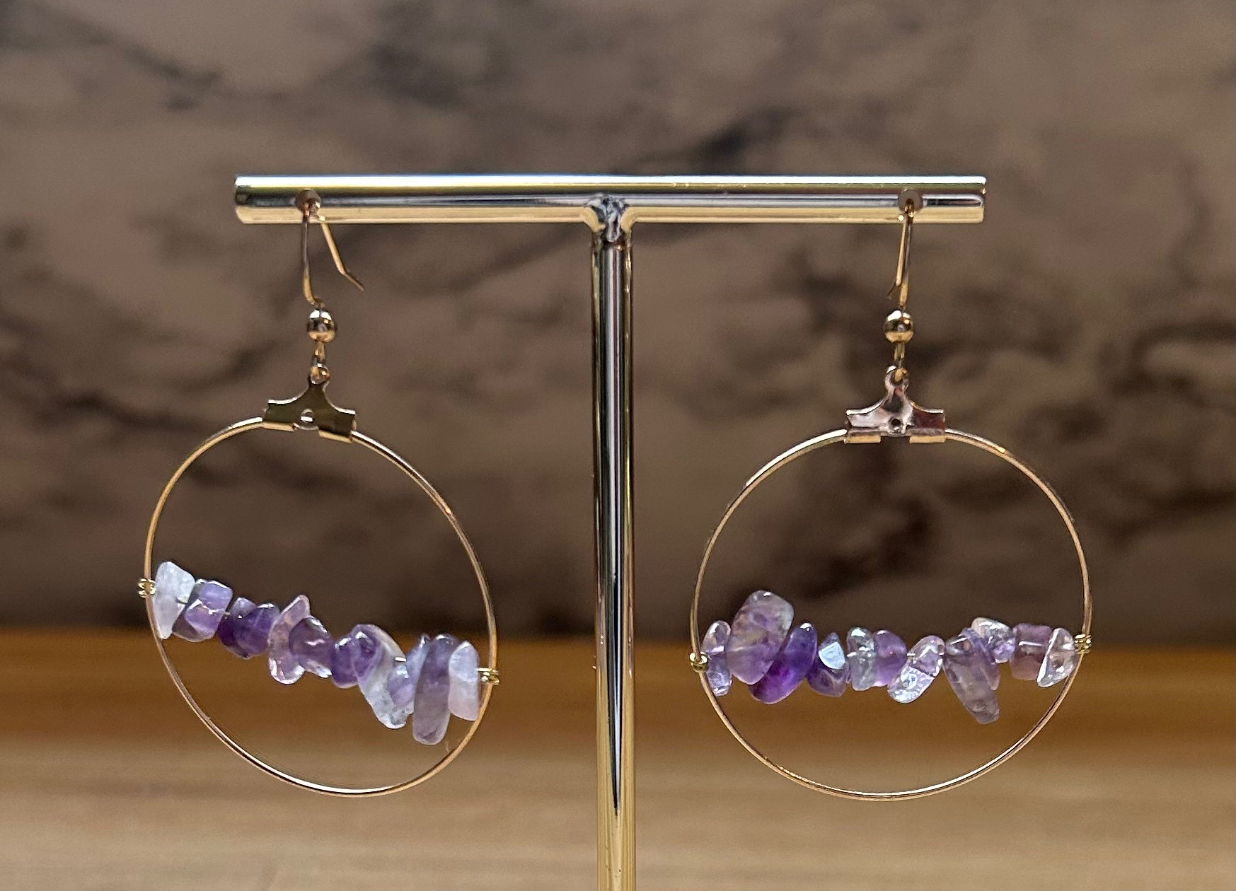 At the heart of these earrings are healing gemstone chips, carefully selected for their vibrant colors and holistic properties. From calming amethyst to energizing citrine, each gemstone imparts its distinct energy to enhance your well-being. The chips are skillfully arranged to create a mesmerizing mosaic of colors and textures, ensuring that every pair is a wearable work of art.